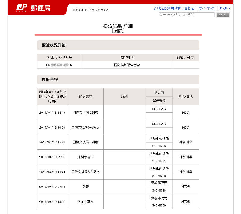 なお、『お問い合わせ番号が見つかりません』と表示される場合は現地の地方郵便局から空港の郵便局に移動している状態のため、2~5日後にシステム反映されます。